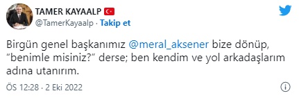 İYİ Parti Kurucu GİK Üyesi Tamer Kayalp, sosyal medya hesabından yaptığı paylaşımda "Birgün genel başkanımız @meral_aksener bize dönüp, 'benimle misiniz?' derse; ben kendim ve yol arkadaşlarım adına utanırım." ifadelerini kullandı.