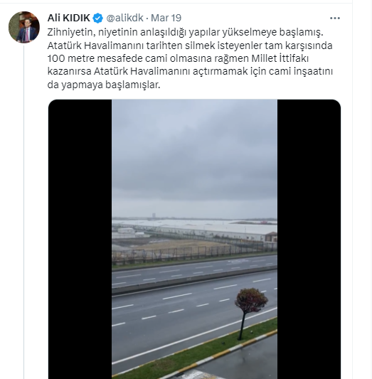 Zihniyetin, niyetinin anlaşıldığı yapılar yükselmeye başlamış. Atatürk Havalimanını tarihten silmek isteyenler tam karşısında 100 metre mesafede cami olmasına rağmen Millet İttifakı kazanırsa Atatürk Havalimanı'nı açtırmamak için cami inşaatını da yapmaya başlamışlar.