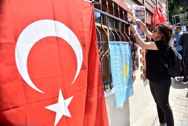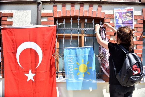 Partililer, Akşener'in evinin kapısına tülbentler asarken, sokağa ise 'Sonuna kadar Akşener' yazılı pankartlar asılması dikkat çekti.