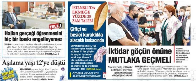 Gazetenin sol alt kısmında yer alan ‘Halkın gerçeği öğrenmesini hiçbir baskı engellemeyez’ başlıklı haberde, İYİ Parti İstanbul Miiletvekili Ahmet Çelik’in bir dönem terör örgütü PKK’nın yayın organı olan Özgür Gündem’de genel yayın yönetmenliği yapan Merdan Yanardağ’ı Tele1’deki makamında ziyaret ettiği görülüyor.
