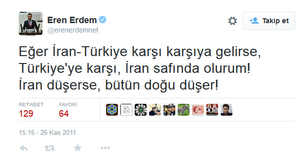 Erdem twitinde "Eğer İran-Türkiye karşı karşıya gelirse, Türkiye'ye karşı, İran safında olurum! İran düşerse, bütün doğu düşer!" hezeyanını savurmuştu.