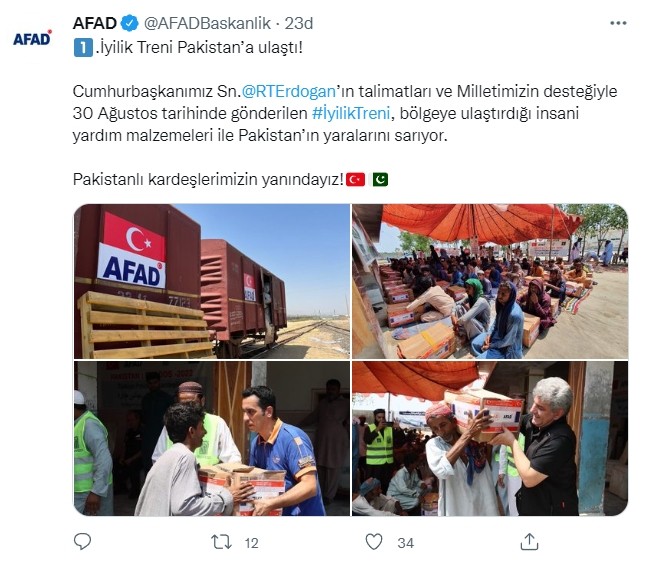 Afet ve Acil Durum Yönetimi Başkanlığı (AFAD) koordinasyonunda bir araya gelen sivil toplum kuruluşlarının desteğiyle Ankara'dan hareket eden birinci "İyilik Treni", sel felaketinin yaşandığı Pakistan'a ulaştı.
