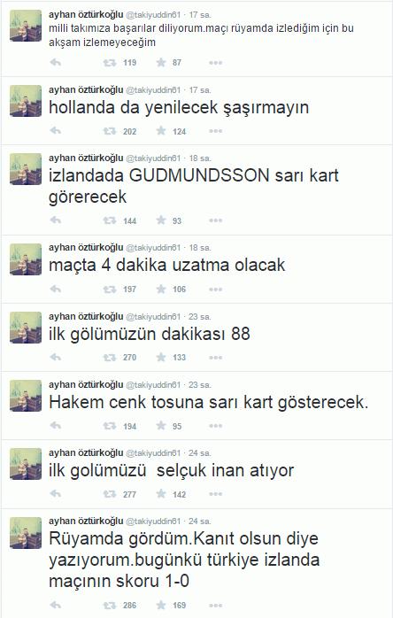 İnegöllü genç twitter hesabından maçtan 7 saat önce, ''Rüyamda gördüm. Kanıt olsun diye yazıyorum. Bugünkü Türkiye-İzlanda maçının skoru 1-0'' diye yazdı. Öztürkoğlu'nun tahminleri bununla da kalmadı. Genç, golü kimin atacağını, Hollanda maçı galibinin kim olacağını da yazdı.