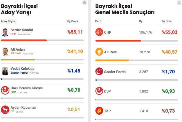 31 Mart 2019 yerel seçim sonçalrına göre İzmir Bayraklı Belediyesi seçimi CHP ve AK Parti adayları arasında geçti. Bayraklı CHP belediye başkan adayı Serdar Sandal oyların yüzde 55.11’ini alarak Bayraklı Belediye başkanı olurken, AK Parti’nin Bayraklı adayı Ali Aslan da oyların yüzde 41,10’unu aldı. Böylelikle CHP adayı Serdar Sandal 2019 yerel seçim sonuçlarına göre, Bayraklı Belediye başkanı seçildi.