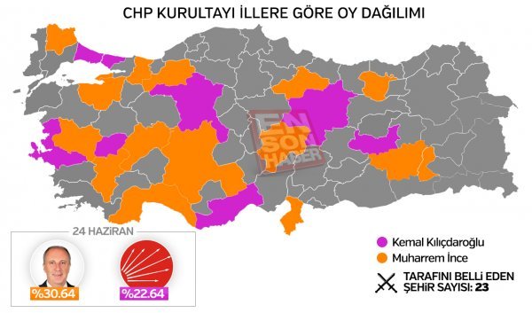 Daha önce, eski haritada görüldüğü gibi, delegeler İzmir'de Kemal Kılıçdaroğlu'nun yanındaydı. Şimdi 50 delegeden 30'u taraf değiştirerek Muharrem İnce'yi destekliyor.