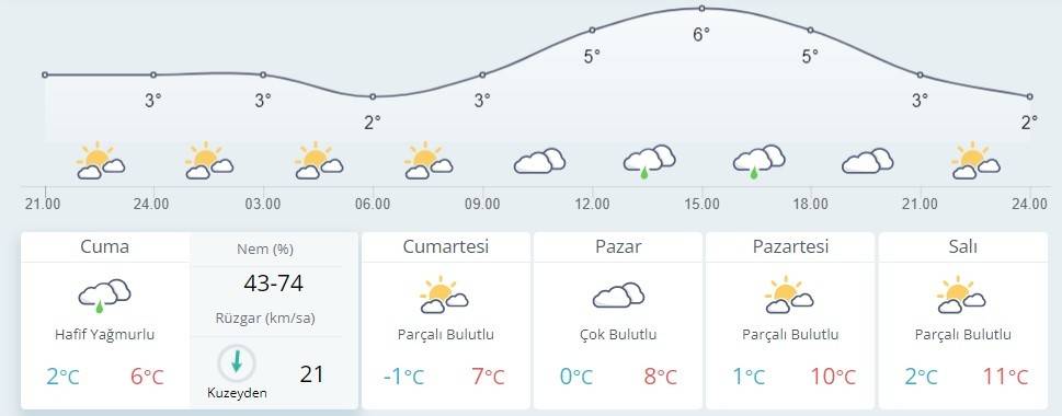 Hava Durumu: Çok bulutlu, karla karışık yağmur ve kar yağışlı; Rüzgar: Kuzey Ege'de kuzey ve kuzeydoğudan 6 ila 8, yarın (Cuma) öğle saatlerinden itibaren 5 ila 7; Güney Ege'de kuzey ve kuzeydoğudan, güneyi kuzeybatıdan 6 ila 8 kuvvetinde, Dalga: 3,0 ila 4,0 m; Görüş: Orta.