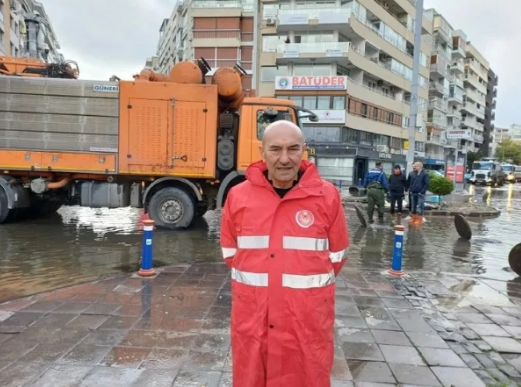 Şehrin merkezi adeta suya gömülürken belediye başkanı Tunç Soyer, bölgeye geldi.