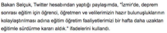 İzmir’de yüz yüze eğitim ne zaman başlayacak? İzmir’de okullar bu hafta açılacak mı? Sorular İzmir depremi sonrası yüz yüze eğitime ara verilmişti. İzmir’deki okulların ne zaman açılacağına ilişkin olarak Milli Eğitim Bakanı Ziya Selçuk açıklamada bulundu.