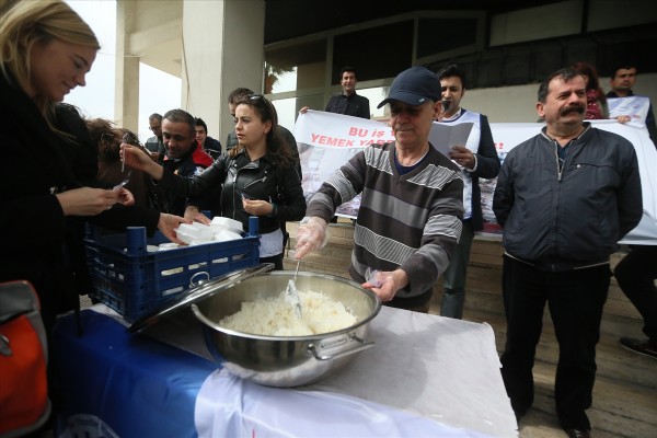 İzmir Büyükşehir Belediyesi'nde çalışan bir grup işçi, toplu iş sözleşmesinde yer alan yemek haklarının verilmediği gerekçesiyle pilav dağıtarak belediye yönetimini protesto etti.