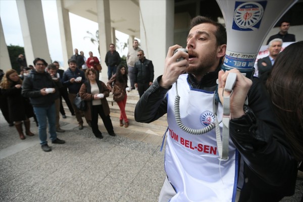 İzmirBüyükşehir Belediyesi'nin Konak'ta bulunan hizmet binasının önünde bir araya gelen işçiler, belediye ile işçiler arasında imzalanan Toplu İş Sözleşmesinde (TİS) yer alan aylık 300 liralık yemek kartı haklarının verilmediğini iddia etti.