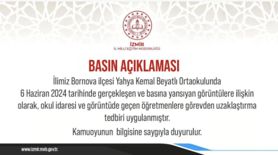 İlimiz Bornova ilçesi Yahya Kemal Beyatlı Ortaokulu'nda 6 Haziran 2024 tarihinde gerçekleşen ve basına yansıyan görüntülere ilişkin olarak, okul idaresi ve görüntüde geçen öğretmenlere görevden uzaklaştırma tedbiri uygulanmıştır.