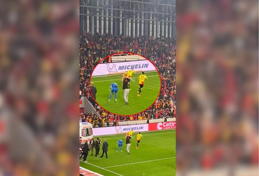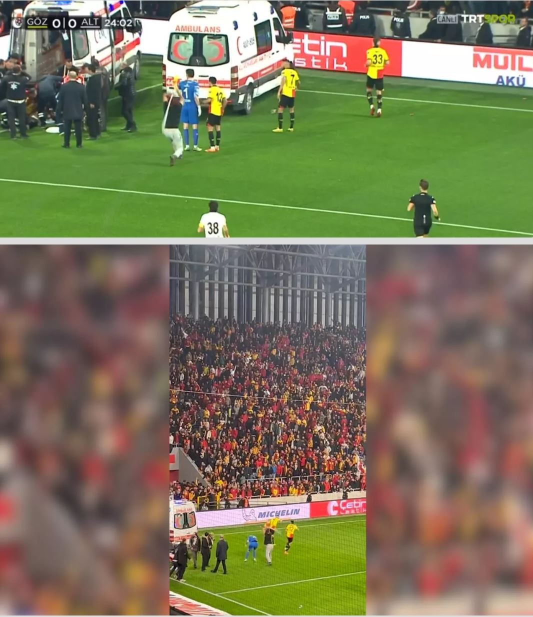 Bunun üzerine sahaya 2 ambulans girdi. Bu sırada sahaya inen bir Göztepe taraftarı korner bayrağı direğini alarak Altay kalecisi Ozan'a saldırdı.