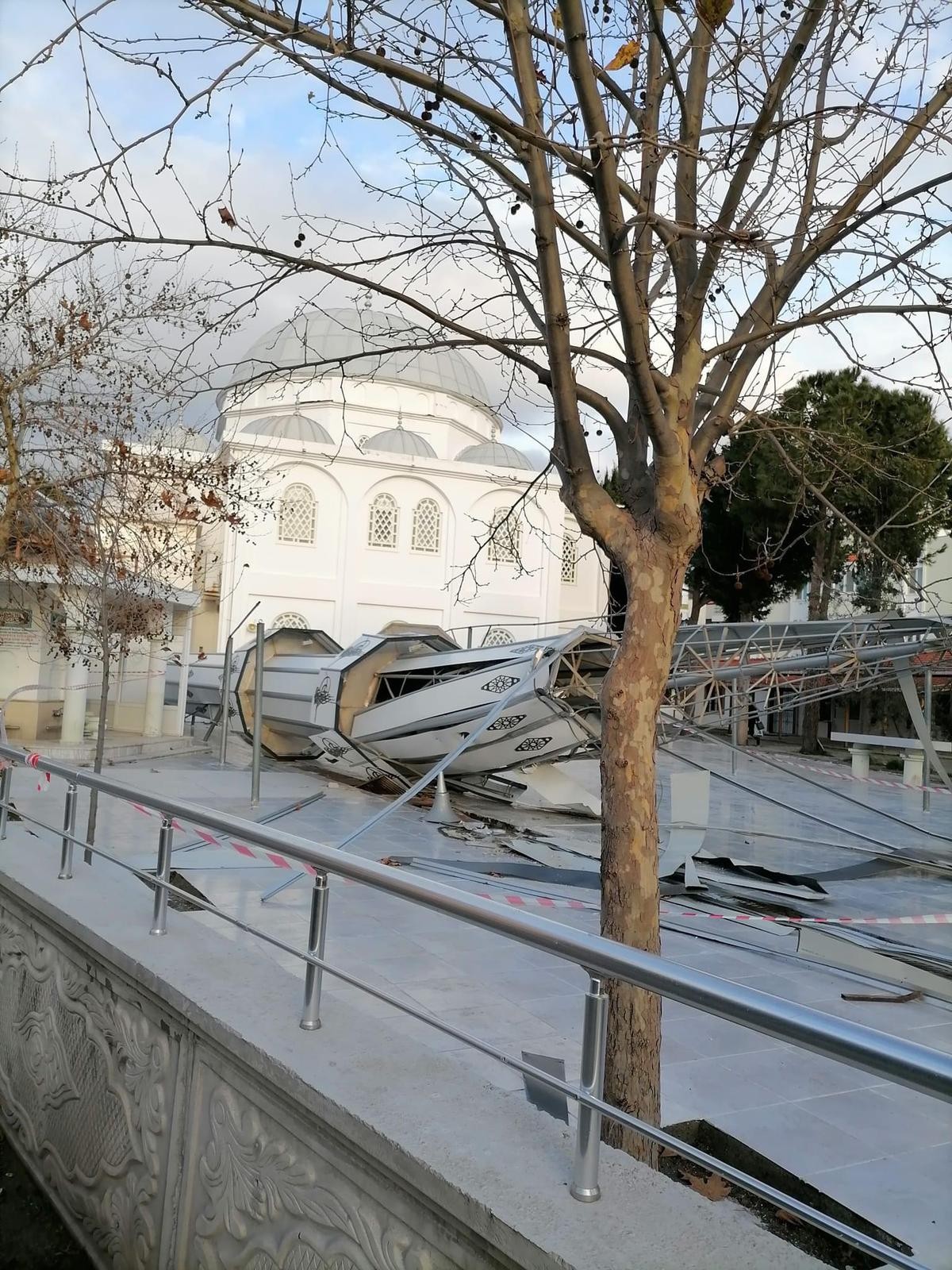 İlçede etkili olan fırtına nedeniyle Rahmi Tokat Camii'nin minaresi yola devrildi.