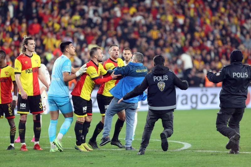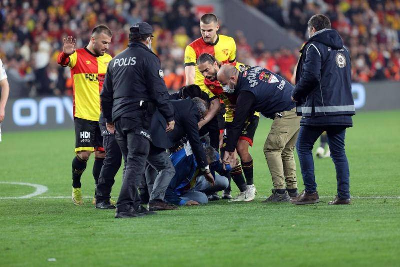 Göztepe - Galatasaray maçının uzatma dakikalarında konuk ekip penaltı kazanınca ortalık karıştı. Göztepeli bazı taraftarlar sahaya indi.