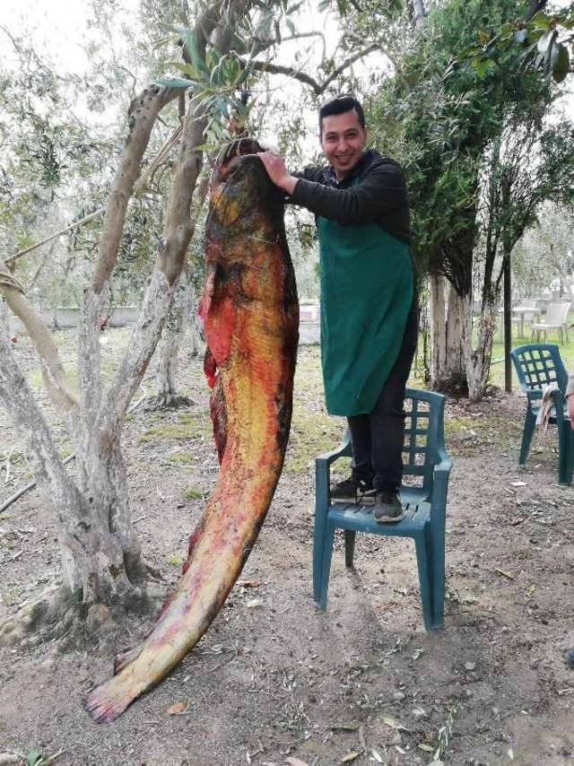 Bursa'da İznik Gölü'nün kırsal Göllüce Mahallesi sahilindenize açılan balıkçıların ağlarına 2 metre 20 santim boyunda, 105 kilo ağırlığında dev yayın balığı takıldı.