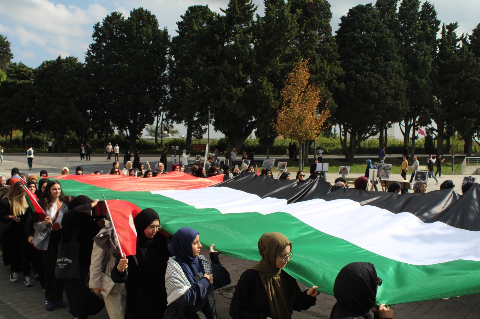 İsrail’in Gazze’ye geçtiğimiz sene Ekim ayında başlattığı saldırıların yıl dönümünde tüm dünyada protesto yürüyüşleri yapılıyor. İstanbul Sabahattin Zaim Üniversitesi öğrencileri de Halkalı Kampüsünde bir araya gelerek Gazze işgalini kınadı. Öğrencilerle birlikte yürüyen İZÜ Rektörü Prof. Dr. Ahmet Cevat Acar, Filistin’de kelimelerin anlatmakta aciz kaldığı bir Siyonist vahşetin sürdüğünü kaydederek tüm insanlık bir araya gelmeden, güçlerini birleştirip karşı koymadan bu zulmün durmayacağını söyledi.