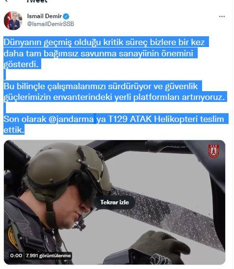 Resmi sosyal medya hesabından paylaşımda bulunan Cumhurbaşkanlığı Savunma Sanayii Başkanı İsmail Demir, “Dünyanın geçmiş olduğu kritik süreç bizlere bir kez daha tam bağımsız savunma sanayiinin önemini gösterdi. Bu bilinçle çalışmalarımızı sürdürüyor ve güvenlik güçlerimizin envanterindeki yerli platformları artırıyoruz. Son olarak @jandarma 'ya T129 ATAK Helikopteri teslim ettik” dedi.