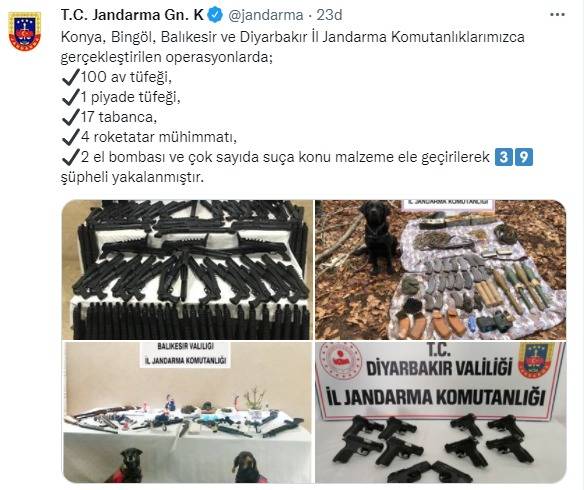Jandarma ekipleri kaçakçılara göz açtırmıyor. Konya, Bingöl, Balıkesir ve Diyarbakır İl Jandarma komutanlıklarında yapılan operasyonlarda çok sayıda silah ve mühimmat ele geçirildiğini duyurdu. Jandarma Genel Komutanlığı sosyal medya hesabı üzerinden yaptığı paylaşımda, “Konya, Bingöl, Balıkesir ve Diyarbakır İl Jandarma Komutanlıklarımızca gerçekleştirilen operasyonlarda; 100 av tüfeği, 1 piyade tüfeği, 17 tabanca, 4 roketatar mühimmatı, 2 el bombası ve çok sayıda suça konu malzeme ele geçirilerek 39 şüpheli yakalanmıştır” ifadelerin kullanıldı.
