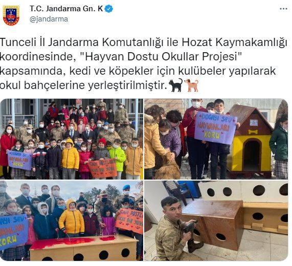 Bir diğer paylaşımda ise Mehmetçiğin çocuk ve hayvan sevgisi bir arada anlatıldı. Tunceli İl Jandarma Komutanlığı ile Hozat Kaymakamlığı koordinesinde, “Hayvan Dostu Okullar Projesi” kapsamında, kedi ve köpekler için kulübeler yapılarak okul bahçelerine yerleştirildiği anlatıldı. Öğrencilerle Mehmetçiğin paylaşıldığı görüntüler büyük ilgi gördü.