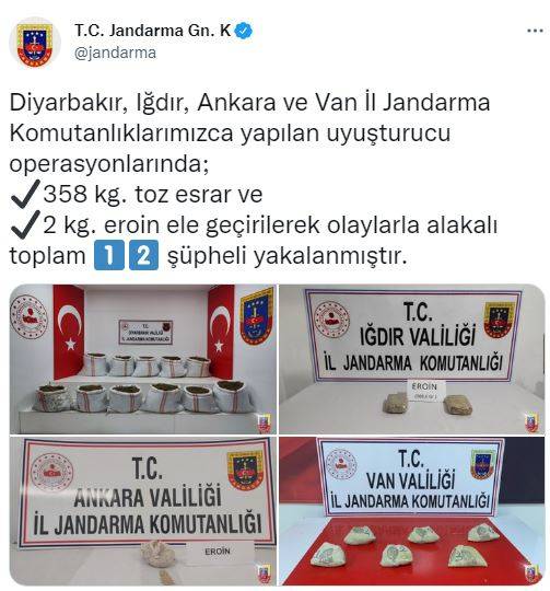 Yapılan açıklamada, “Diyarbakır, Iğdır, Ankara ve Van İl Jandarma Komutanlıklarımızca yapılan uyuşturucu operasyonlarında; 358 kg. toz esrar ve 2 kg. eroin ele geçirilerek olaylarla alakalı toplam 12 şüpheli yakalanmıştır” denildi.