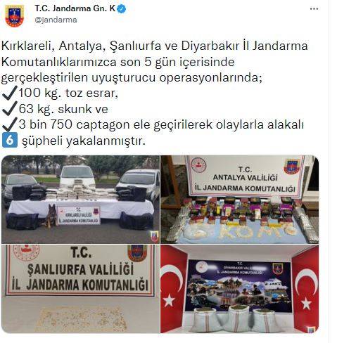 Jandarma Genel Komutanlığı resmi soysal medya hesabından yapılan paylaşımda, ''Kırklareli, Antalya, Şanlıurfa ve Diyarbakır il jandarma komutanlıklarımızca son 5 günde gerçekleştirilen operasyonlarda, 100 kilogram toz esrar, 63 kilogram skunk ve 3 bin 750 captagon ele geçirilerek 6 şüpheli yakalanmıştır” ifadeleri yer aldı.