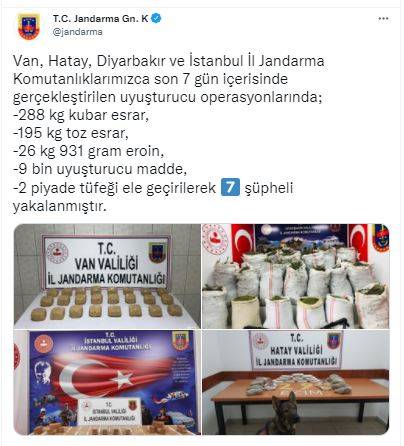 Açıklamada, “Van, Hatay, Diyarbakır ve İstanbul İl Jandarma Komutanlıklarımızca son 7 gün içerisinde gerçekleştirilen uyuşturucu operasyonlarında; 288 kg kubar esrar, 195 kg toz esrar, 26 kg 931 gram eroin, 9 bin uyuşturucu madde, 2 piyade tüfeği ele geçirilerek 7 şüpheli yakalanmıştır” denildi.