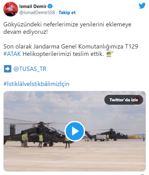 Gelişmeyi resmi Twitter hesabı üzerinden duyuran Savunma Sanayii Başkanı İsmail Demir, "Gökyüzündeki neferlerimize yenilerini eklemeye devam ediyoruz! Son olarak Jandarma Genel Komutanlığımıza T129 ATAK Helikopterilerimizi teslim ettik" ifadelerini kullandı.