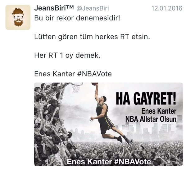 İstanbul Cumhuriyet Başsavcılığı, Twitter'da FETÖ'ye yakınlığıyla bilinen Enes Kanter için destek hashtag'i açan "Jeansbiri" adlı Twitter kullanıcısı şahıs hakkında "silahlı terör örgütüne üye olmak" suçundan yakalama kararı çıkardı.