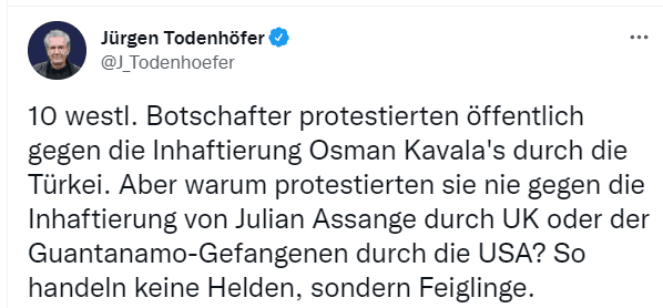 "10 Batılı büyükelçi, Osman Kavala'nın Türkiye tarafından hapsedilmesini protesto etti. Ama neden Birleşik Krallık'ta Julian Assange'nin ya da ABD'nin Guantanamo mahkumlarının hapsedilmesini protesto etmediler? Kahramanlar böyle değil, korkaklar böyle davranır."