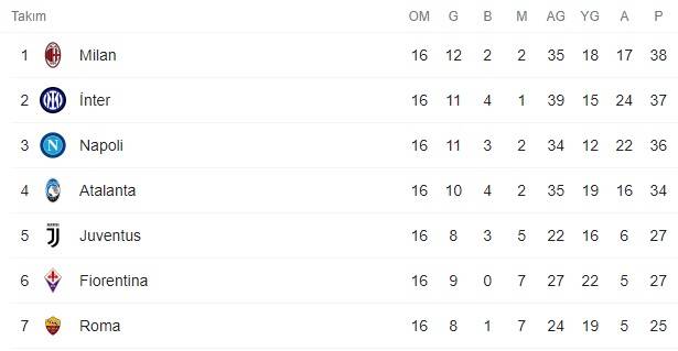 20 takımın bulunduğu Serie A'da Juventus 5.sırada yer alıyor. Juventus bu sezon çıktığı 16 maçta 8 galibiyet 3 beraberlik ve 5 mağlubiyetle 27 puan topladı. Serie A'nın zirvesinde ise 38 pualı Milan yer alıyor. Milan'ı 37 puanla Inter, 36 puanla Napoli ve 34 puanla Atalanta takip ediyor.