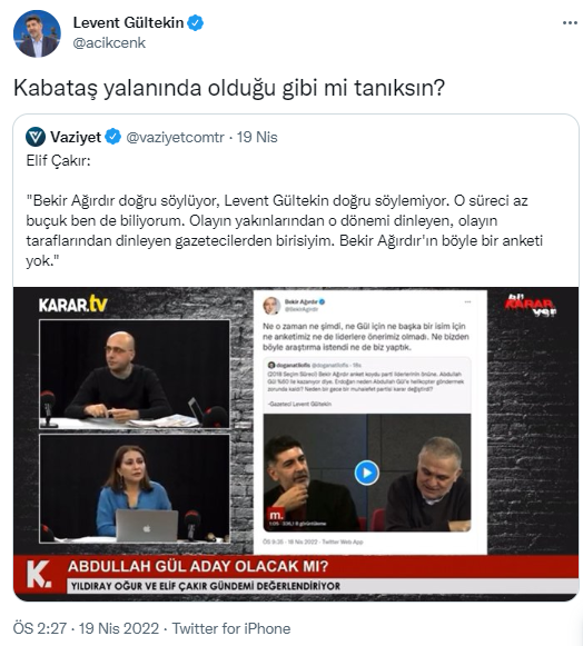 Elif Çakır "Bekir Ağırdır doğru söylüyor, Levent Gültekin doğru söylemiyor. O süreci az buçuk ben de biliyorum. Olayın yakınlarından o dönemi dinleyen, olayın taraflarından dinleyen gazetecilerden birisiyim. Bekir Ağırdır'ın böyle bir anketi yok." ifadesini kullandı.
