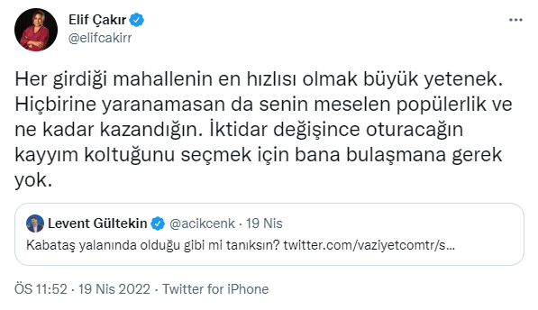 Elif Çakır, bu ifadelerinin ardından Gültekin'in hedefi oldu. Gültekin, sosyal medya hesabından, "Kabataş yalanında olduğu gibi mi tanıksın?" ifadesinde bulundu.