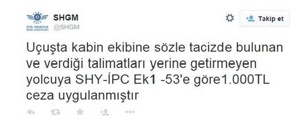 Sivil Havacılık Genel Müdürlüğü (SHGM), kabin ekibine sözlü tacizde bulunan bir yolcuya bin lira ceza kesti.