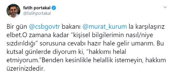 Amerikan sermayeli FOX TV sunucusu Fatih Portakal, Çevre ve Şehircilik Bakanı Murat Kurum’a kişisel verilerinin bazı gazetelere sızdırıldığını iddia ederek soru sordu.