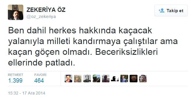 Hakkında çıkan yakalama kararından kurtulmak için Gürcistan'a kaçan eski Ergenekon Savcısı Zekeriya Öz'ün kaçacağını iddia edenlere hakaret eden bir mesajı ortaya çıktı. Öz, 18 aralık 2014'te twitter'dan "Ben dahil herkes hakkında kaçacak yalanıyla milleti kandırmaya çalıştılar ama kaçan göçen olmadı. Beceriksizlikleri ellerinde patladı" yazmıştı.