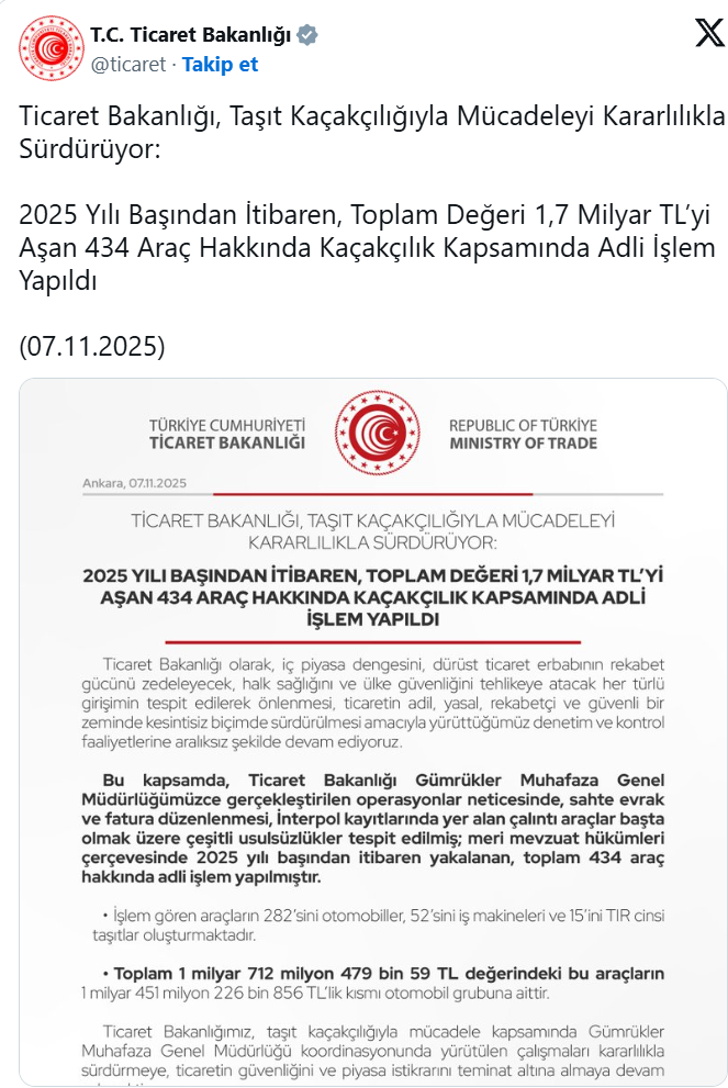Ticaret Bakanlığı, 2025 yılı başından itibaren, toplam değeri 1,7 Milyar TL'yi aşan 434 araç hakkında kaçakçılık kapsamında adli işlem yapıldığını duyurdu.
