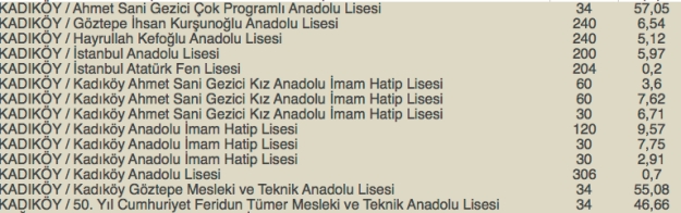 Kadıköy liselerin taban puanları ve en düşük yüzdelik dilimleri 2020