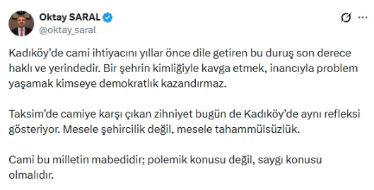 Cumhurbaşkanı Başdanışmanı Oktay Saral, Kadıköy Belediye Başkanı’nın ve Mimarlar Odası’nın cami projesine yönelik saldırgan tutumuna sosyal medya üzerinden cevap verdi. Taksim Camii’ne karşı çıkan zihniyetin bugün aynı refleksi Kadıköy’de sergilediğini belirten Saral, şu ifadelerle ders verdi: