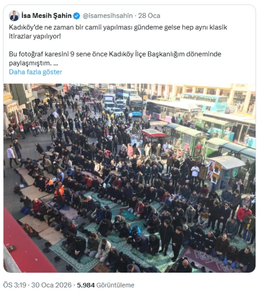 CHP listelerinden seçildikten sonra aslına rücu ederek AK PARTİ’ye geçen İsa Mesih Şahin de cami düşmanlarına sert çıktı. 9 yıl önce Kadıköy İlçe Başkanlığı döneminde paylaştığı bir kareyi hatırlatan Şahin, "Yeni bir cami Kadıköy merkezin ihtiyacıdır. Camilerimiz kutsal mabedlerimizdir ve siyasi polemik konusu yapılması doğru değildir. Kadıköy sahiline yapılacak bir cami, İstanbul'umuzun silüetine değer katacaktır." dedi.