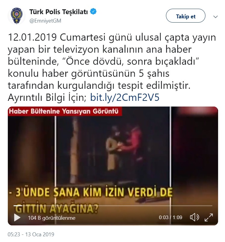 Emniyet Genel Müdürlüğünden yapılan yazılı açıklamada, Ünye ilçesinde bir kadının bir erkek tarafından darbedilerek, bıçaklandığına dair "Önce dövdü, sonra bıçakladı" başlıklı haberin görüntülerinin Show TV'nin ana haber bülteninde yer almasının ardından, araştırma yapıldığı belirtildi.