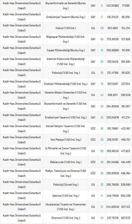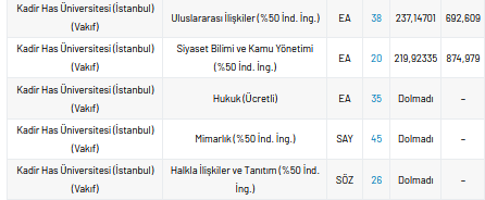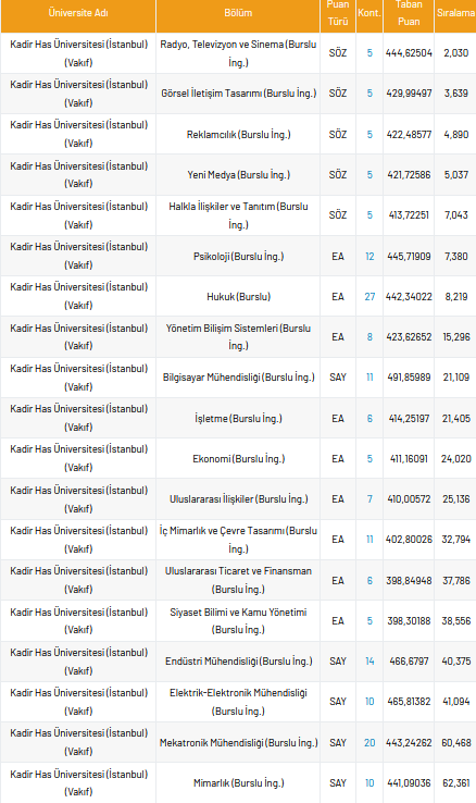 Kadir Has Üniversitesi taban puanları 2021, yüzdelik dilimleri ve kontenjan sayıları kaçtır?