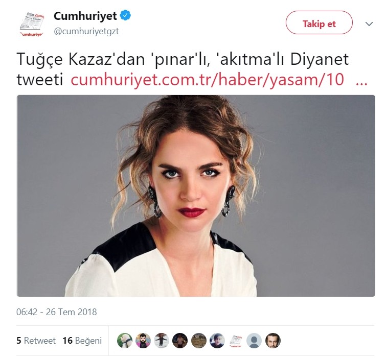 YENİAKİT.COM.TR - Mankenliği ve oyunculuğu bırakmasından yakınan Cumhuriyet paçavrası, sosyal medya hesabından paylaşım yapan Tuğçe Kazaz'ın attığı bir tweeti iğrenç bir şekilde haberleştirdi.