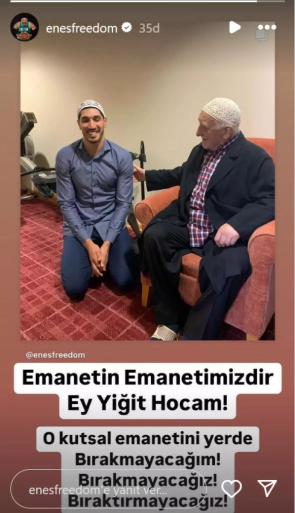 ABD'de geberen FETÖ elebaşı Fetullah Gülen'in manevi oğlu olarak bilinen basketbolcu Enes Kanter, sosyal medya hesabından yaptığı paylaşımla Gülen'i rüyasında gördüğünü belirtip bir sürü zırva anlattı.
