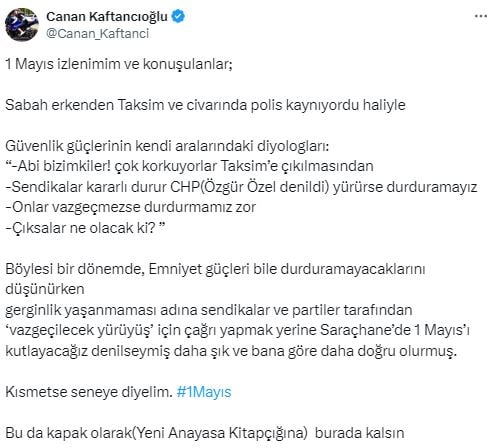 Eski CHP İstanbul İl Başkanı Canan Kaftancıoğlu, Saraçhane'de 1 Mayıs provokatörlerini topladıktan sona Taksim'e yürümekten vazgeçerek alandan ayrılan CHP Genel Başkanı Özgür Özel'e tepki gösterdi.