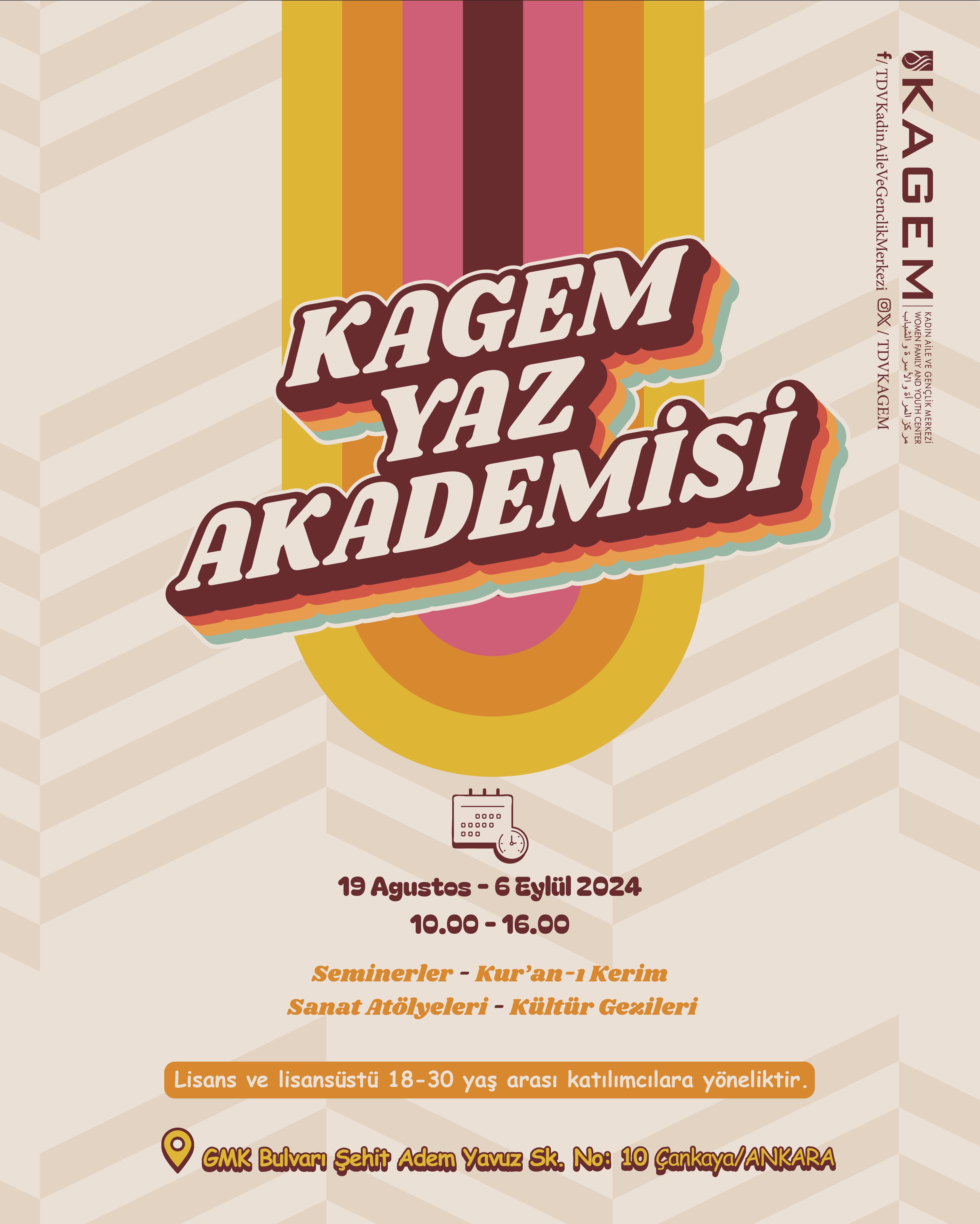 Türkiye Diyanet Vakfı Kadın, Aile ve Gençlik Merkezi (KAGEM), 18-30 yaş arasındaki lisans ve lisansüstü öğrencilerine yönelik bir yaz akademisi düzenliyor. 19 Ağustos - 06 Eylül 2024 tarihleri arasında gerçekleşecek olan KAGEM Yaz Akademisi, çeşitli etkinlikler ve eğitimlerle dolu olacak.