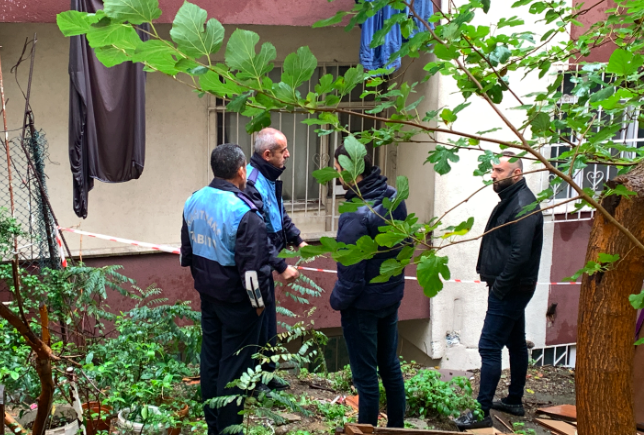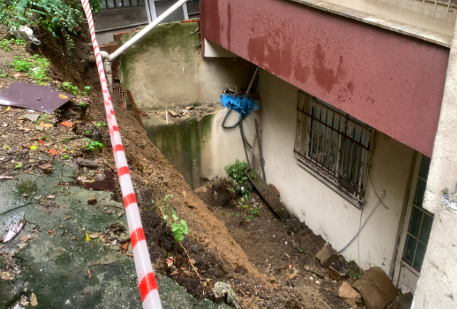 Yan apartmanda oturan Birol Cigaoğlu, "Arkadaki binanın çatı suyu bizim binanın arkasına akıyor ve bu yağmur suları birikip göllenme oluyor. Yan binanın arkasında istinat duvarı çöktü. Bu olay her iki binayı da riske sokuyor. Her yağmurda buralar su içinde kalıyor. Arkadaki binanın çatısındaki giderlerin düzgün bağlanması lazım. Yoksa her yağmurda bu sorun devam eder" dedi.