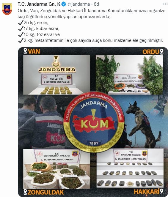 Jandarma Genel Komutanlığı tarafından yapılan paylaşımda, “Ordu, Van, Zonguldak ve Hakkari İl Jandarma Komutanlıklarımızca organize suç örgütlerine yönelik yapılan operasyonlarda; 25 kg. eroin, 17 kg. kubar esrar, 10 kg. toz esrar ve 2 kg. metamfetamin ile çok sayıda suça konu malzeme ele geçirilmiştir” ifadeleri kullanıldı.