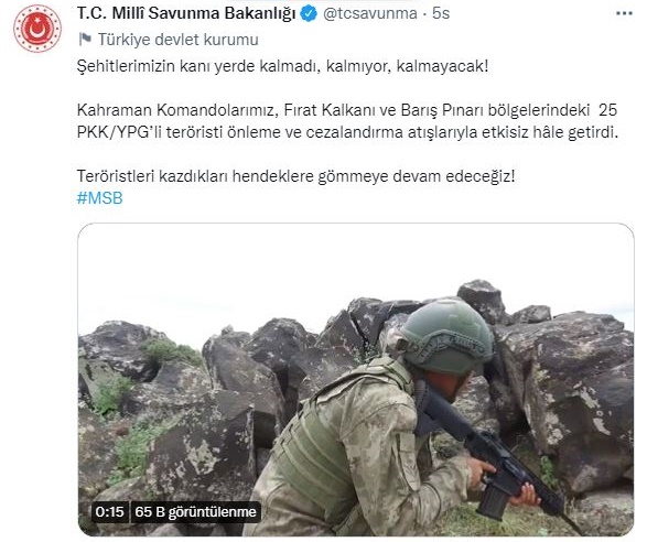 Milli Savunma Bakanlığı tarafından yapılan paylaşımda, “Şehitlerimizin kanı yerde kalmadı, kalmıyor, kalmayacak! Kahraman Komandolarımız, Fırat Kalkanı ve Barış Pınarı bölgelerindeki 25 PKK/YPG’li teröristi önleme ve cezalandırma atışlarıyla etkisiz hâle getirdi. Teröristleri kazdıkları hendeklere gömmeye devam edeceğiz!” denildi.