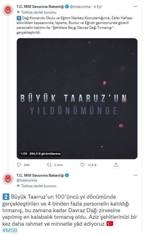 MSB tarafından yapılan videolu paylaşımda, “Dağ Komando Okulu ve Eğitim Merkezi Komutanlığınca, Zafer Haftası etkinlikleri kapsamında; Isparta, Burdur ve Eğirdir garnizonunda görevli personelin katılımı ile “Şehitlere Saygı Davraz Dağı Tırmanışı” gerçekleştirildi. Büyük Taarruz’un 100’üncü yıl dönümünde gerçekleştirilen ve 4 binden fazla personelin katıldığı tırmanış, bu zamana kadar Davraz Dağı zirvesine yapılmış en kalabalık tırmanış oldu. Aziz şehitlerimizi bir kez daha rahmet ve minnetle yâd ediyoruz” ifadeleri kullanıldı.
