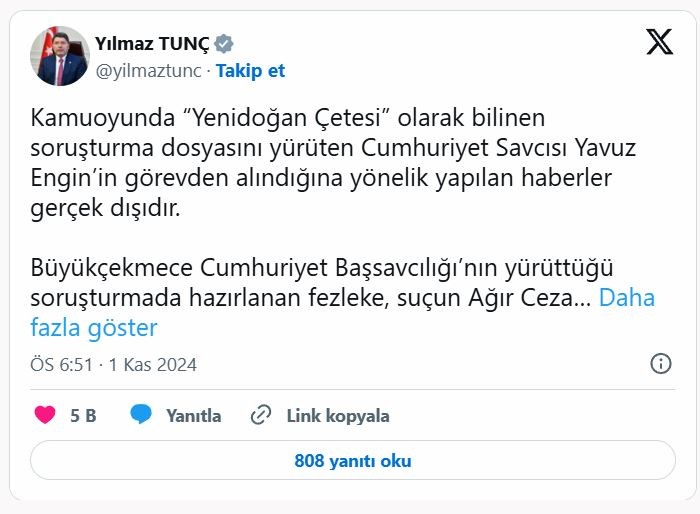 Cumhuriyet Savcımızın görevden alınması söz konusu olmayıp Büyükçekmece Cumhuriyet Başsavcılığı’ndaki görevine devam etmektedir. Ayrıca Büyükçekmece Cumhuriyet Savcısı’nın tehdit edilmesi ile ilgili olarak ve yine aynı konuda diğer şüpheliler bakımından soruşturma Büyükçekmece Cumhuriyet Başsavcılığı’nda titizlikle yürütülmektedir.
